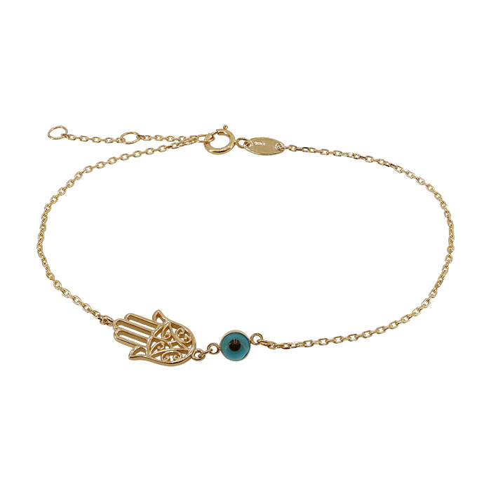 10KT Gold, 8x12mm Hamsa and 4mm evil eye bracelet, 6.5″ + 0.5″ + 0.5″ extension