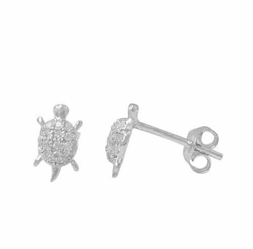 Rhodium plated on Sterling Silver, Turtle shape stud earrings with faceted stones. Approx frame size: 8.5mm L X 5mm W X 2mm T.