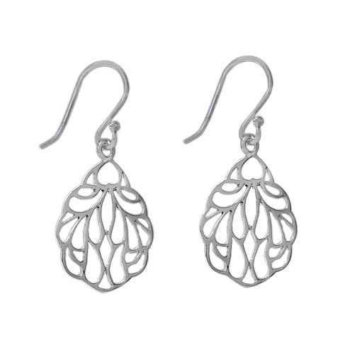 Sterling Silver, flat teardrop shape earring with filigree design. Approx frame size: 20mm L x 16mm W x 1mm T.