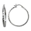 Sterling Silver, diamond cut, flat round shape hoop earring with clip closure. Approximate size: 35mm Diameter x 2mm Thickness.