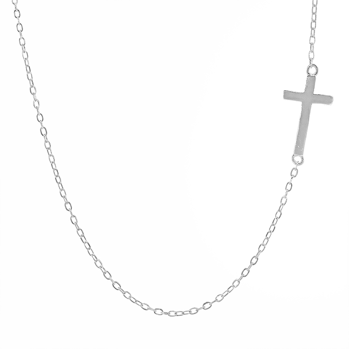 Sterling silver with rhodium, sideways Cross (12x8mm) charm necklace, 14″+2″ extension