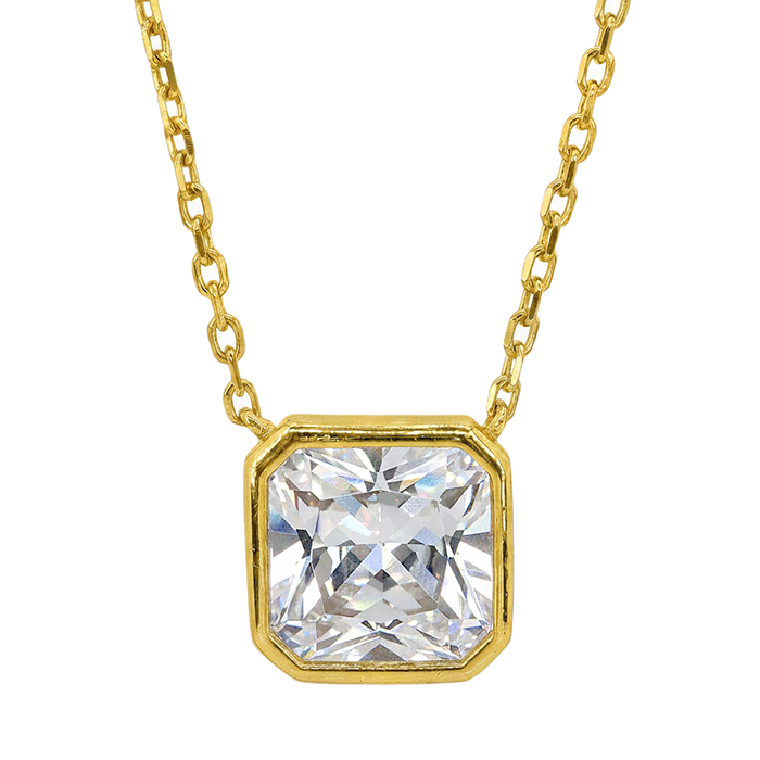 Sterling silver with gold, 9.5×9.5mm square cubic zirconia charm necklace, 16″ + 2″ extension